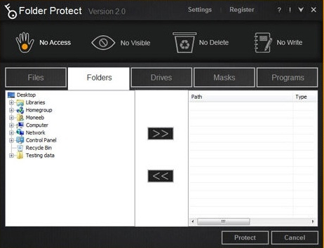 Folder Protect 2.0.5 provides a simple and also straightforward means to choose safety and security kind and also make your files hard to reach, concealed, write-protected and also delete-proof by choosing No Gain access to, No Noticeable, No Write as well as No Remove specifically. You could likewise establish a combination of these protection kinds according to their requirements; e.g. No Remove and No Write can be picked all at once to earn your files delete-proof and also write-protected.